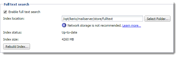 Mặt định Kerio Connect chỉ cho search subject và email nếu muốn search được các nội dung khác như body attach hay all folder các bạn cần Enable Full text