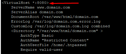 3. Vào VirtualHost website mà bạn muốn cấu hình port thêm vào *:8080: