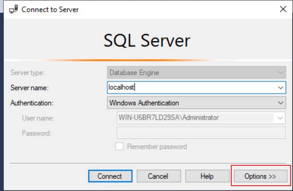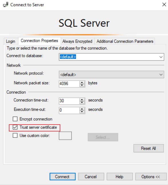 2. Đối với Microsoft SQL Server Management trước khi connect các bạn chọn Option > Connect Properties và chọn Trust server certificate