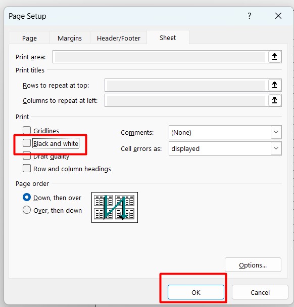 2. Ở Khung Page Setup > Chọn Sheet và bỏ check Black and White > Chọn OK