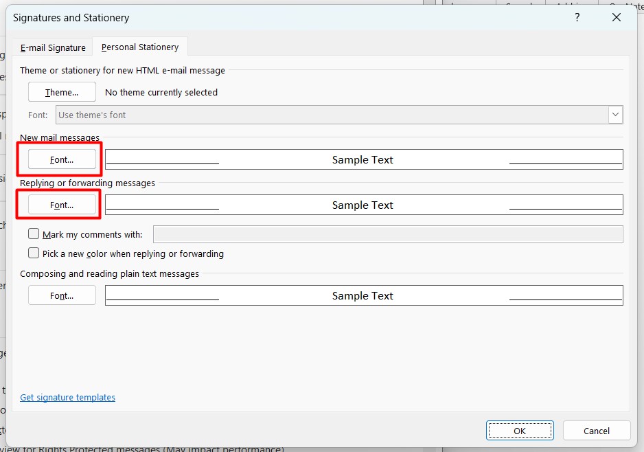 4. Tại của sổ Signatures and Stationery các bạn chọn vào Font
