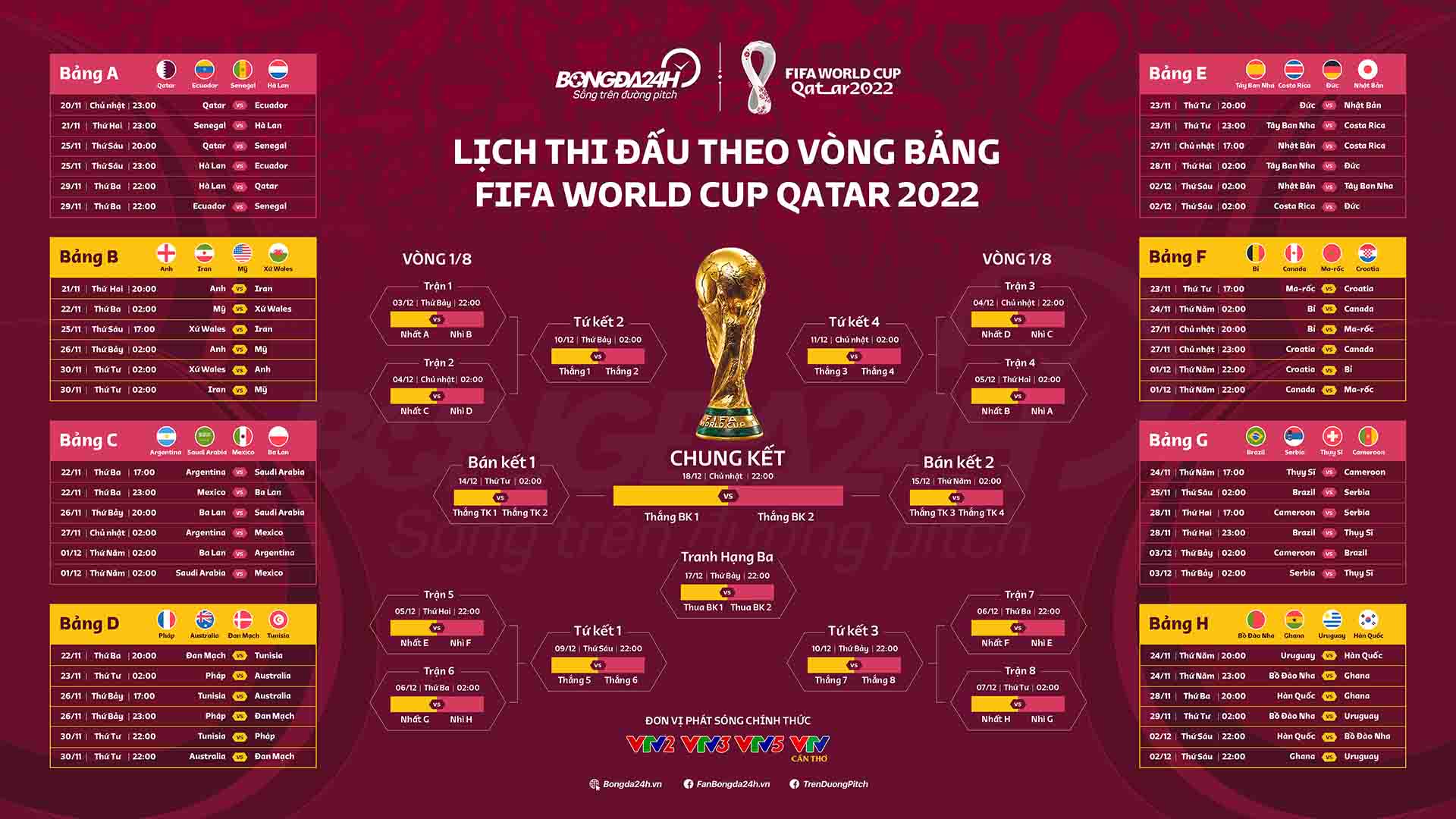 Lịch thi đấu World Cup 2022 sẽ diễn ra từ ngày 20/11 đến ngày 18/12, tại Qatar. Đây là kỳ World Cup đầu tiên trong lịch sử được tổ chức vào mùa đông, thay vì vào mùa hè như thường lệ. Theo đó, vòng bảng sẽ khởi tranh từ ngày 20/11 đến ngày 3/12. Đội chủ nhà Qatar đá trận khai mạc còn trận đấu muộn nhất vòng bảng là giữa Cameroon với Brazil.