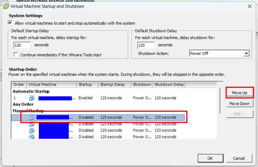 4. Chọn VM mà bạn cần cho auto sau đó chọn Move Up cho nó lên mục Automatic Startup rồi chọn OK nhé.