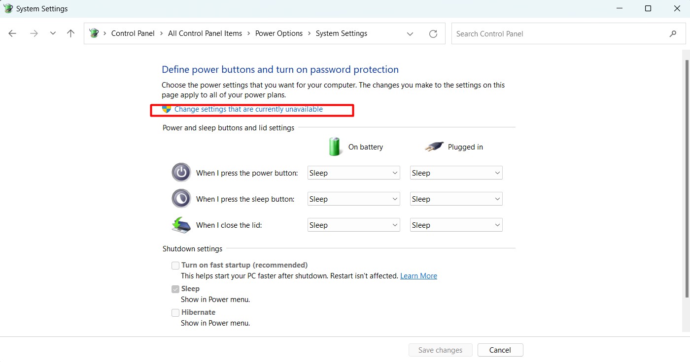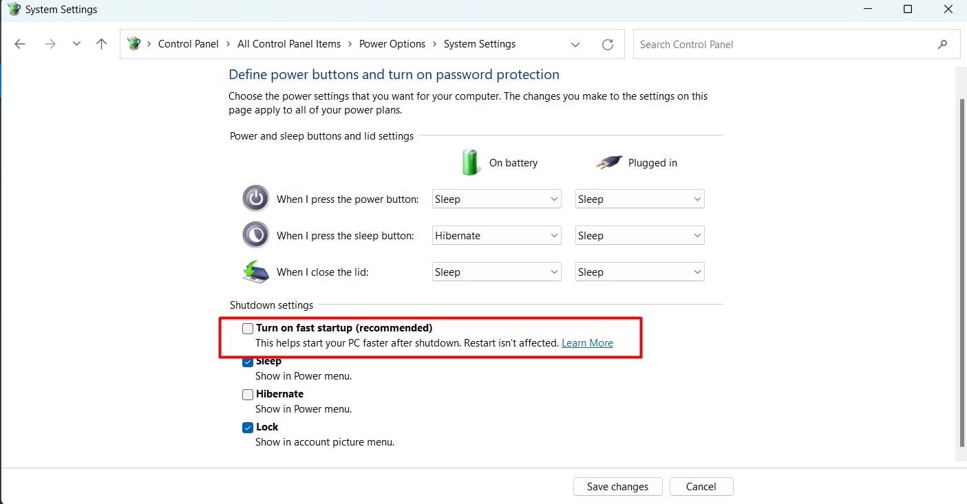 - Bỏ chọn Turn on fast startup (Recommended) sau đó Save changes.